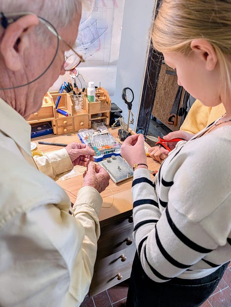 The next day, the teenagers made jewelry. Thanks to Bob, who doesn’t even speak the language and yet installed a corner of his own world inside ours, a real workbench with pliers, stones, wires, and precise tools. The girls laugh, hesitate, focus. And the idea of “using a space” is no longer just words: it’s a pair of earrings they imagined, shaped, and took with them.